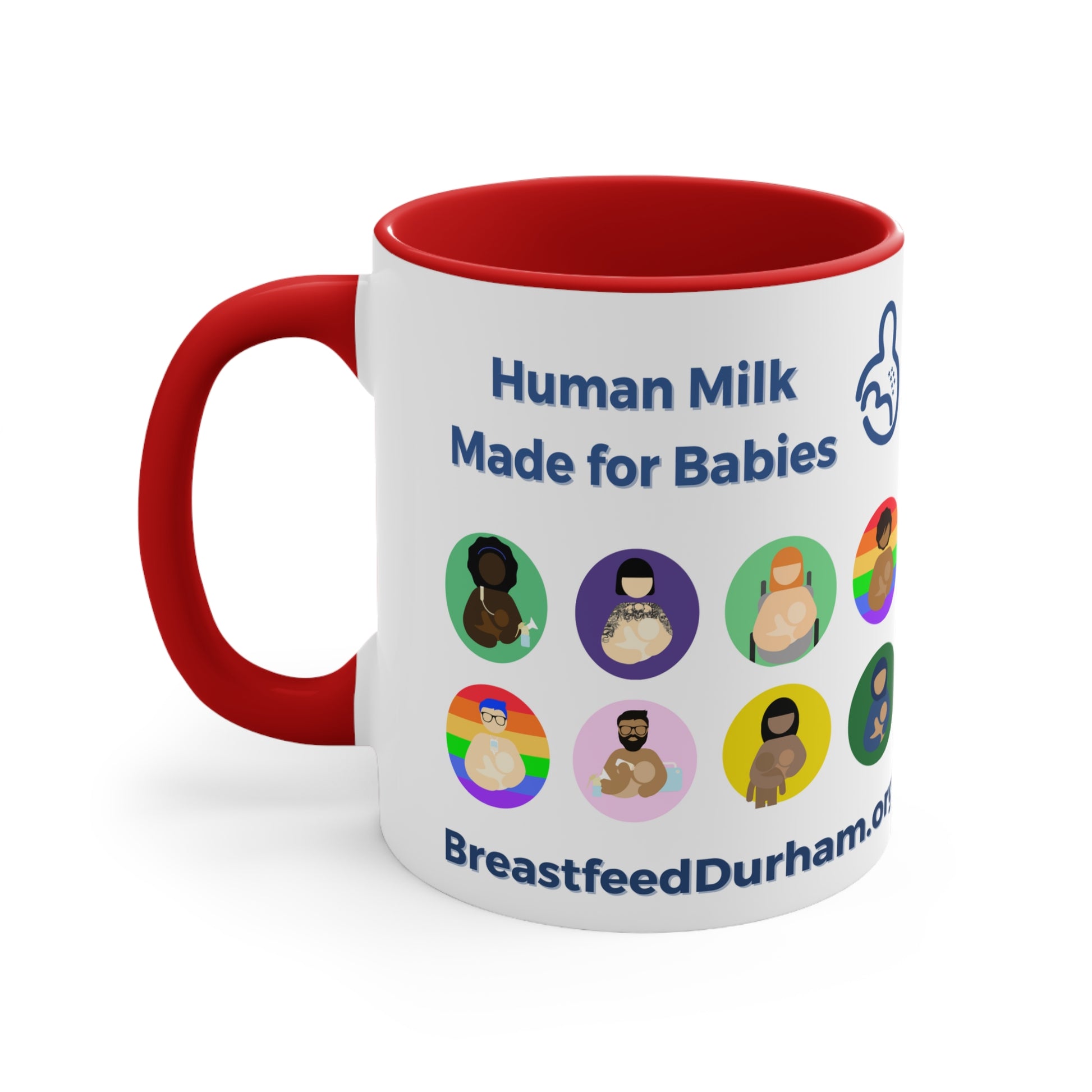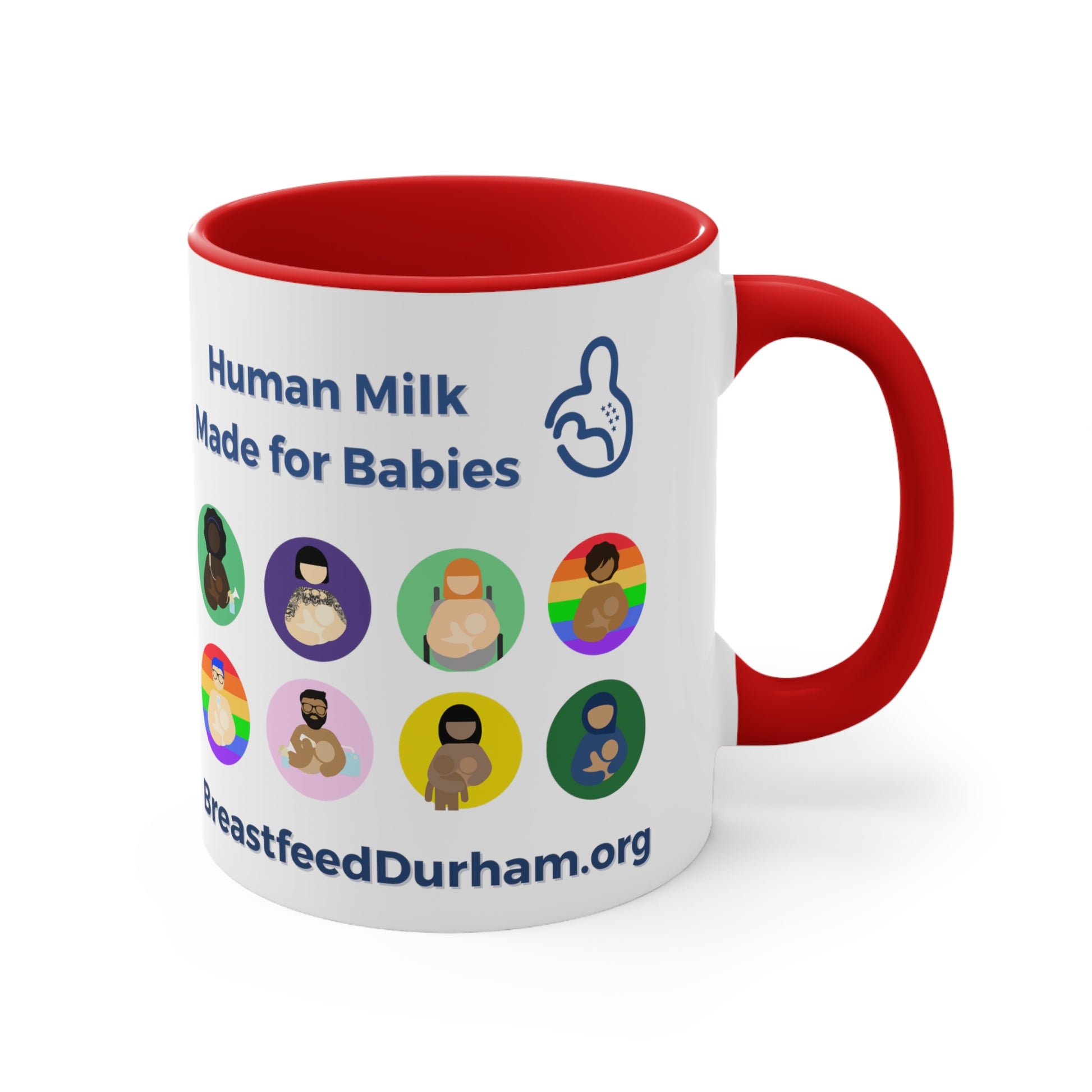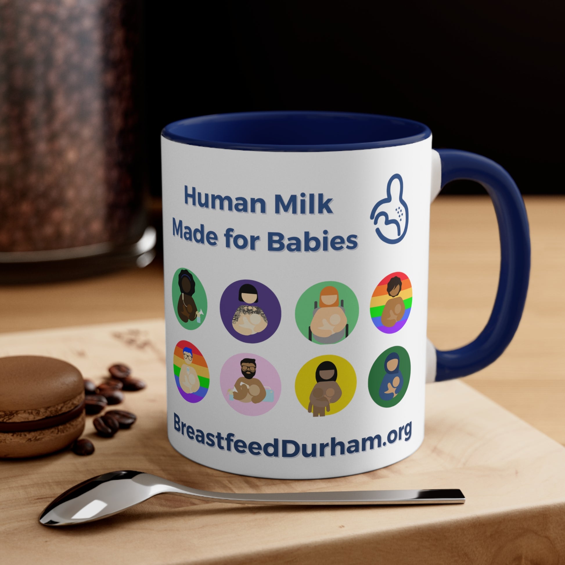 Begin your day with a dose of inspiration and a splash of color with our 'Human Milk for Human Babies' coffee mug, proudly featuring the Breastfeed Durham logo alongside diverse and beautiful images of lactation. This custom accent mug isn't just a drinkware item; it's a statement of support and a daily reminder of the beauty and natural importance of breastfeeding.