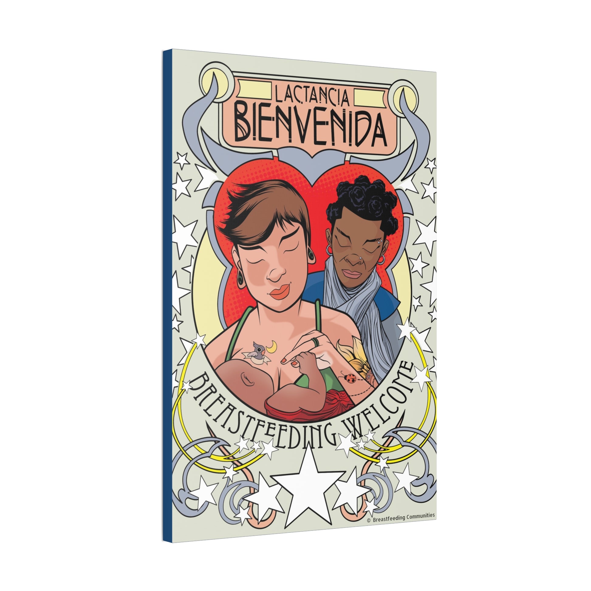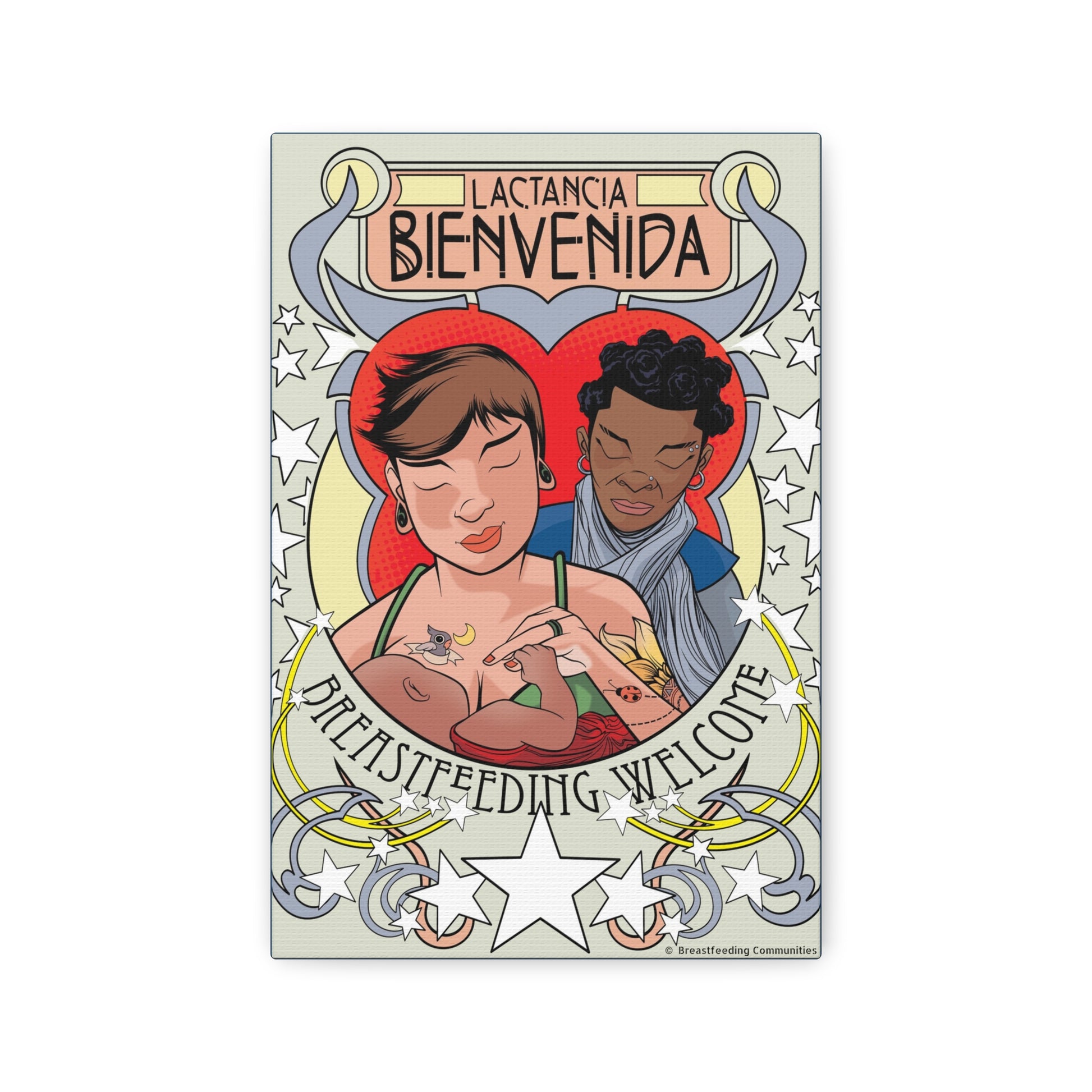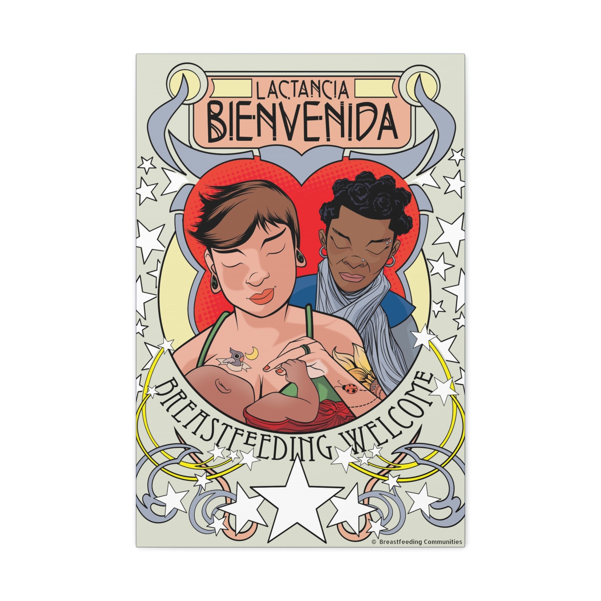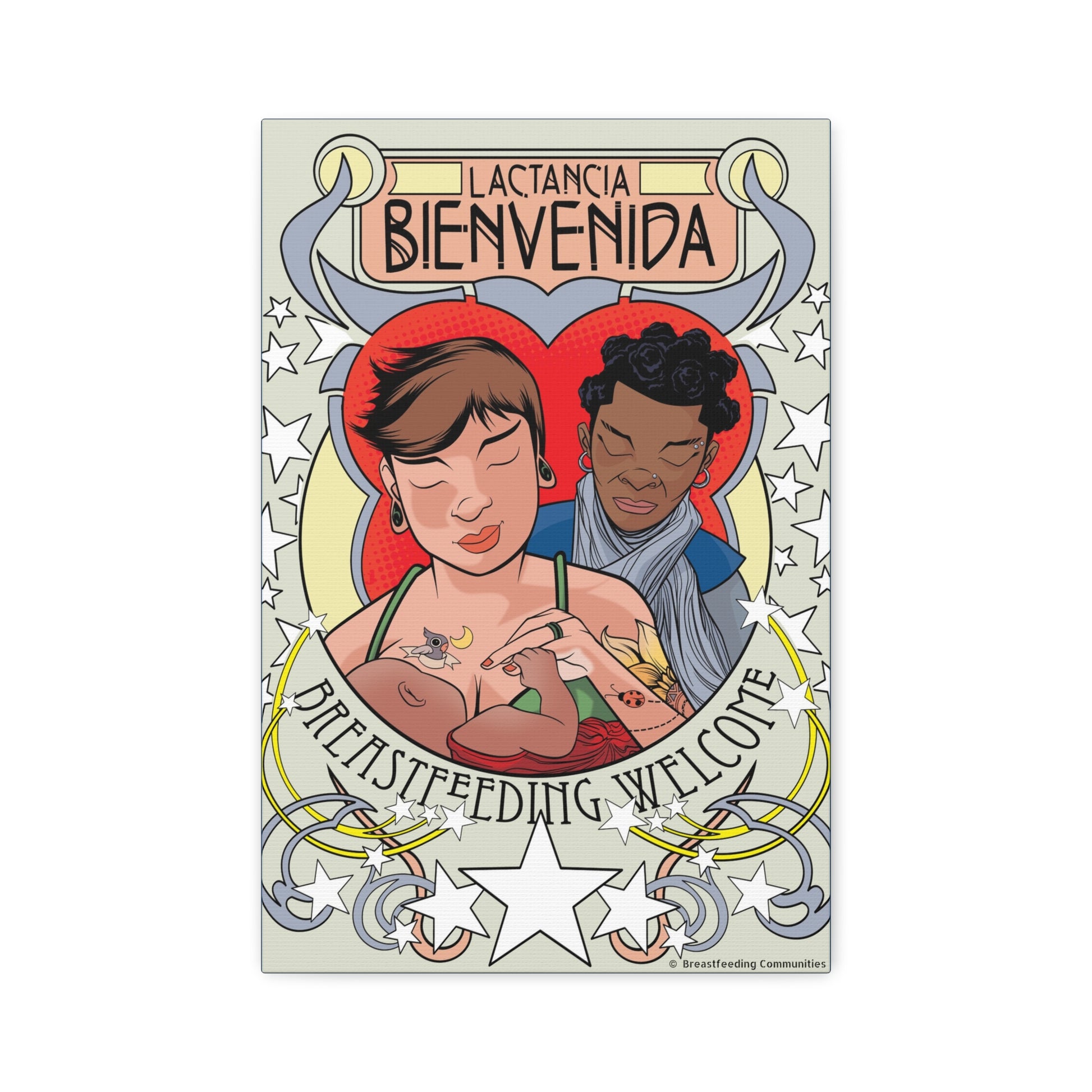 Atop the canvas, the words "Lactancia Bienvenida" and "Breastfeeding Welcome" invite families from all backgrounds, offering a universal message of support and acceptance in both Spanish and English.